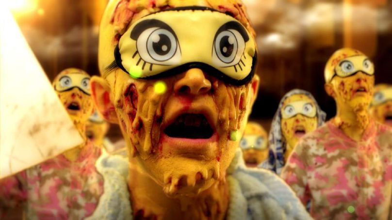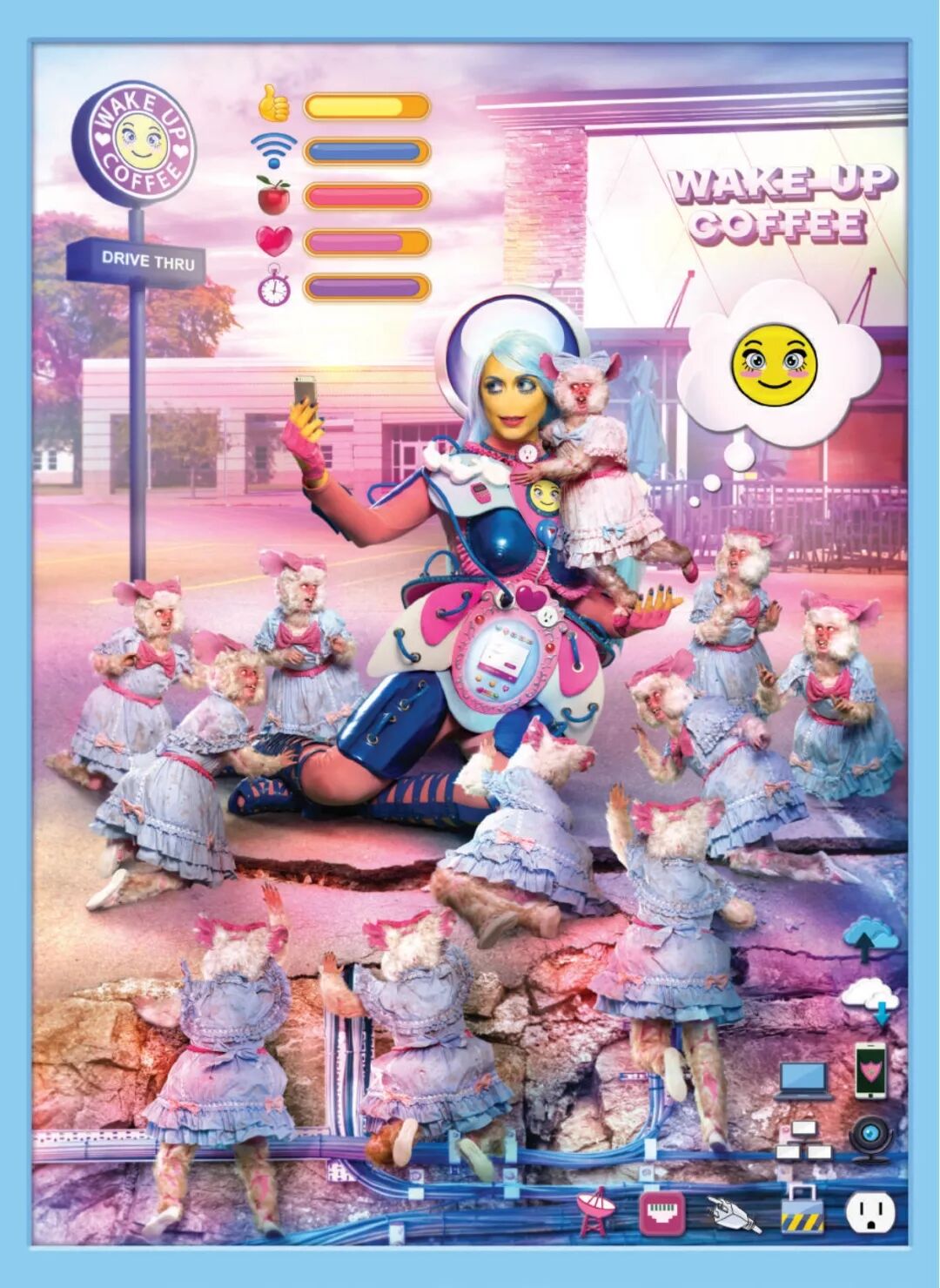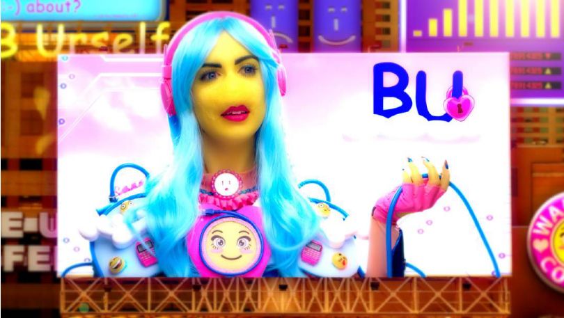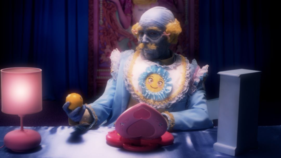 影片中,艺术家倾情扮演着一位身着彩色塑料盔甲,自拍有术的“卡戴珊型”半神——数据,带着聊天表情符号的黄色皮肤,蓝色及腰长发,以及因脸部整形过度而不知所踪的鼻子,被身穿毛绒睡衣、戴着卡通大眼眼罩、皮肤融化直至面部变形的大众簇拥膜拜。