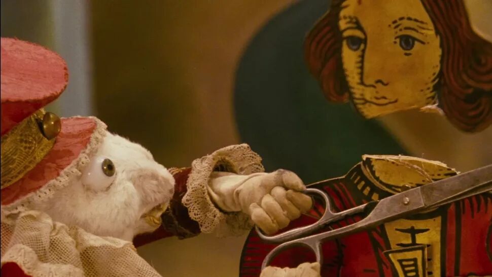 这些怪诞甚至让人感到不适的角色,深受捷克定格动画大师杨·史云梅耶(Jan Svankmajer)的超现实主义风格影响。在他1988年的影片《爱丽丝》(Neco z Alenky)中,小女孩爱丽丝在自己的房间玩耍,一只兔子闯入了她的玻璃橱柜,爱丽丝跟随这只奇怪的兔子爬进抽屉,但这里并不是我们熟知的爱丽丝仙境——兔子肚子里竟然填满了木屑,还有一把专门用来砍头的大剪刀。