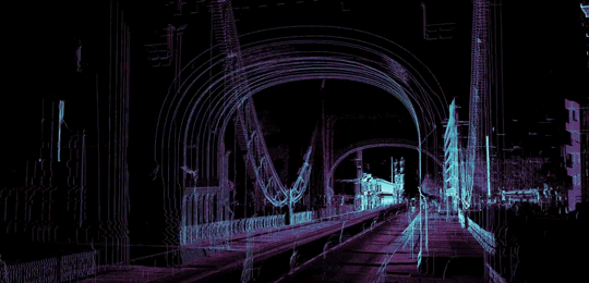 盲点和偏移成为了 ScanLAB 想要放大的东西。于是,因为需要转弯而对街角的景致进行了重复渲染,钟楼出现了幽灵般的叠影。伦敦塔桥上的缓慢车辆,因为故意没有实施校正的数据累积,变成了奇幻的迷幻隧道。真人视角下平庸乏味的街景,在智能传感技术的“视野”里美得让人窒息。