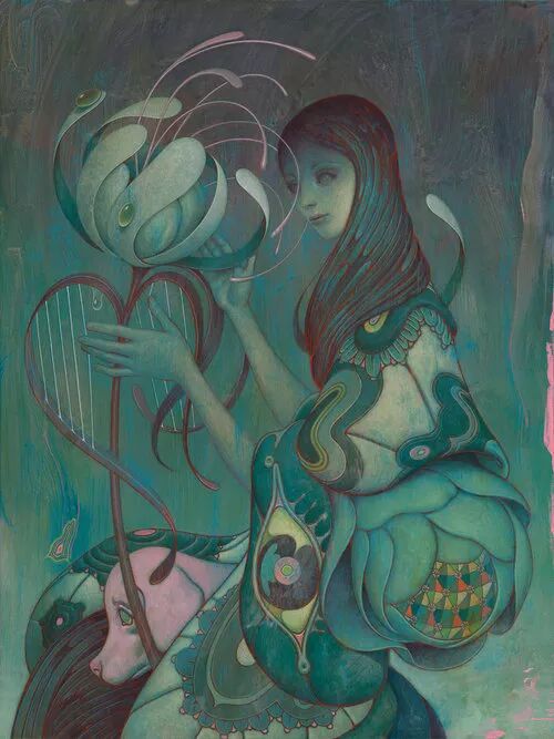 手无疑比电脑更具有自然而然的延续性力量,正如 James Jean 的绘画由截然不同但拥有相似氛围的元素之间的神秘力量所贯穿。他从来无法在创作开始前就构思好整幅作品,而是需要在过程中从一个灵感通往下一个灵感,并将逐渐浮现的可能性整理呈现,形成画面中拥有多种可能性的故事线索。