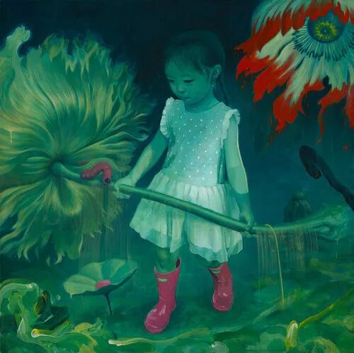James Jean 常用的意象中不乏拥有和谐之美潜质的事物,比如花、少女、婴孩,但它们最终都成为暗黑、荒诞和诡异的化身,成为美的反击者。“一些东西过于美好,就很无趣。遇到纯粹的美时,我总感觉被冒犯了。”文化变异者的身份令他作出了另一种选择。