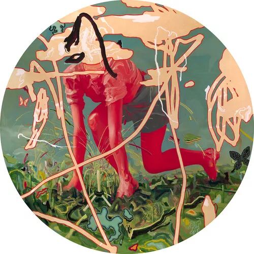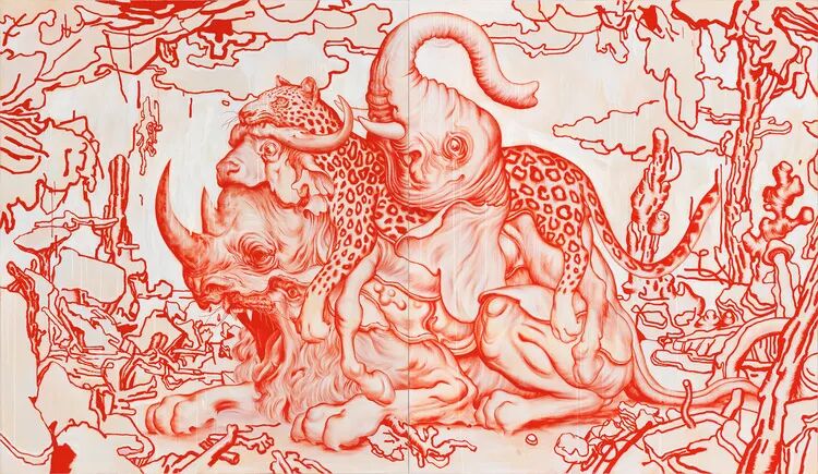 2015年,他通过村上隆的 GEISAI∞infinity 项目在东京举办个展,展出的“Zugzwang”系列作品,可以说是这种文化突变的全面展现。Zugzwang 以蓝、红、粉色为基调,充满了难以确切溯源的半人半仙半妖的形象、神秘的符号和异想的故事情节。其中,全景式描绘了终极末日景象的《Pagoda II》,也被艺术家自己认为是一幅里程碑式的作品。