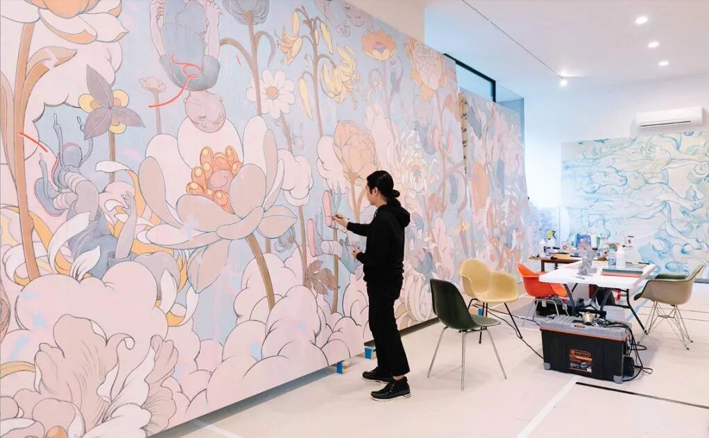 然而 James Jean 并非完全退回到传统的绘画世界,在“小大阪”区那个由 Frank Gehry 于1970年设计、Daniel Brunn 改造的现代与日式风格共存的房子里,他为了绘画而在物理上与外部世界隔绝开来,但也会通过听播客、看新闻,每天消费大量互联网上的信息。“有时甚至对新闻上瘾。”