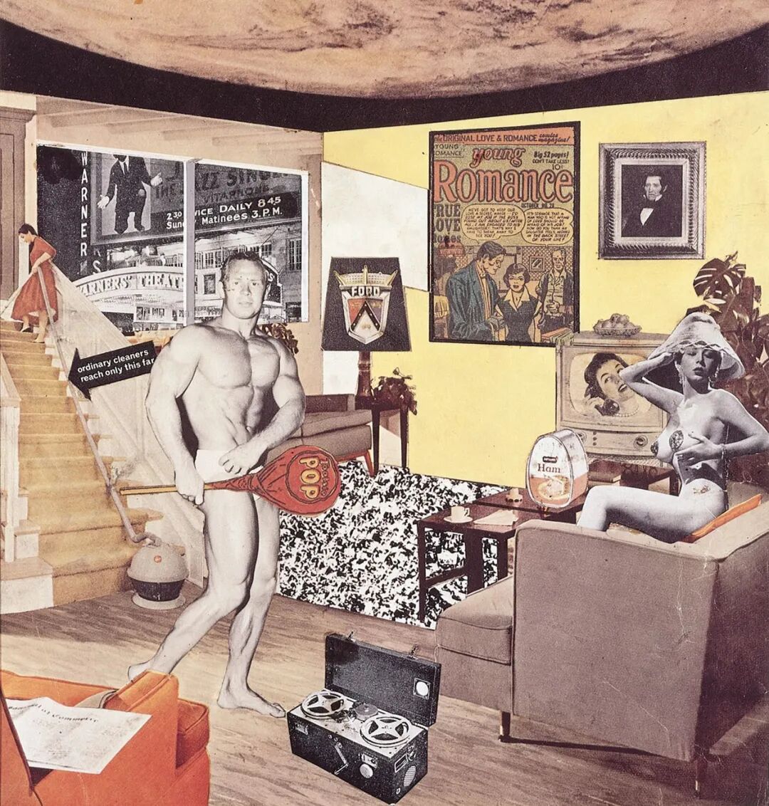 被人称为英国波普艺术之父的理查德·汉密尔顿,在 1956 年创作的《是什么使今日的家庭变得如此不同,如此有魅力》就是这一时期的代表作,他把当时社会认为必须出现在家庭中的男人、女人、报刊杂志、汽车、视频、电视、录音机等元素通通放入画面中,以表达对对当时美国社会特定阶层空虚的家庭生活的嘲讽,“POP”一词也首次出现在大众视野中。