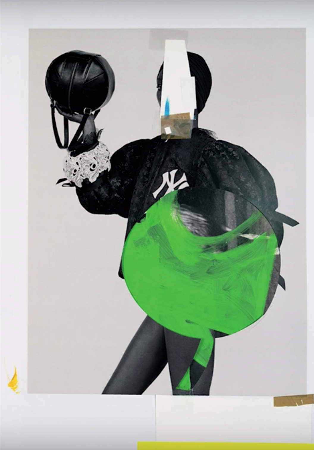 通过把具体的图像或是绘画形象与意义不明的图形、物品、符号结合在一起、重新构建画面,Baumann不断地探索着时尚摄影与抽象绘画之间的界限,催生了一种拼贴这种看待视觉表达的全新路径,也成为她所有创作中的核心要素。