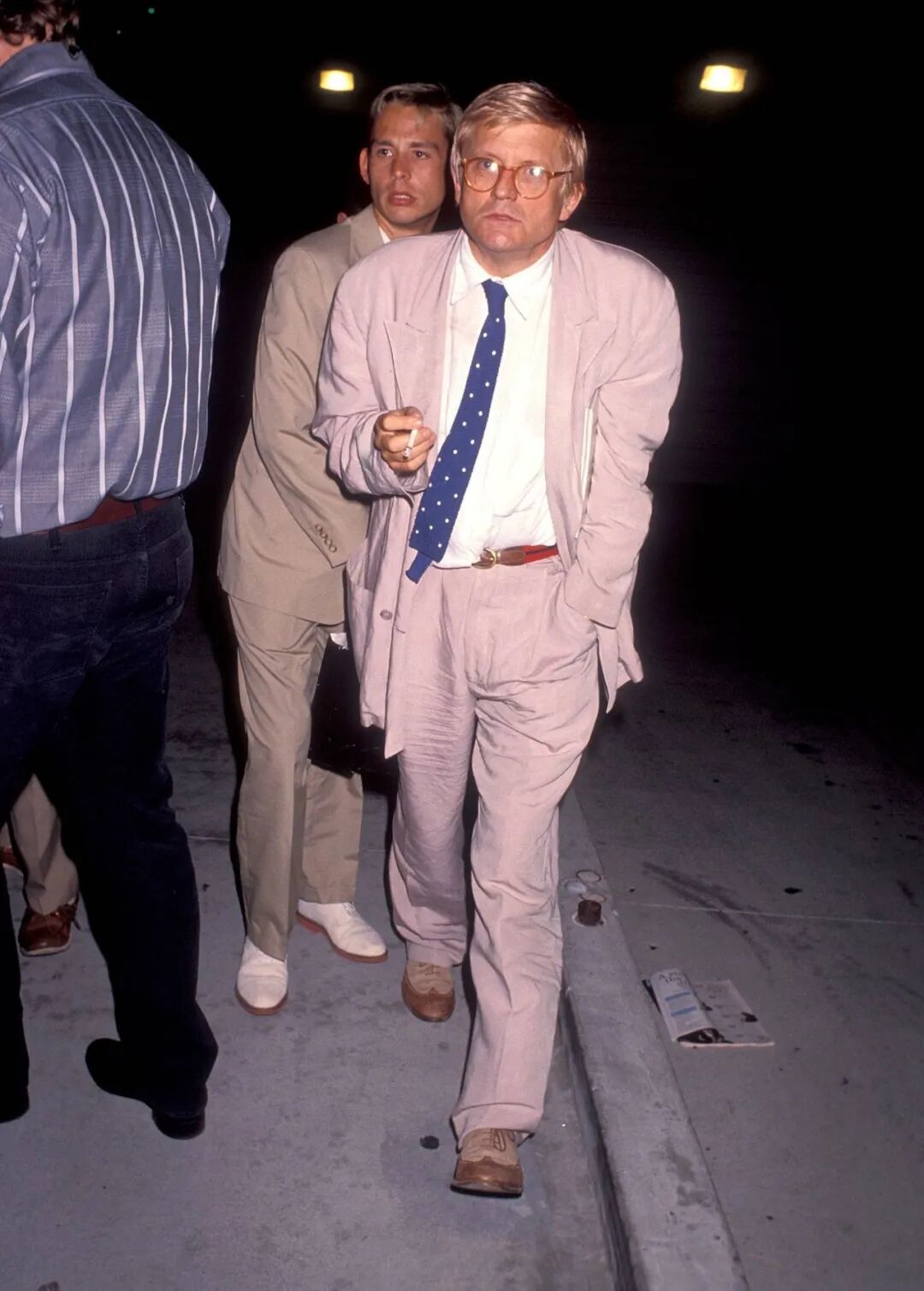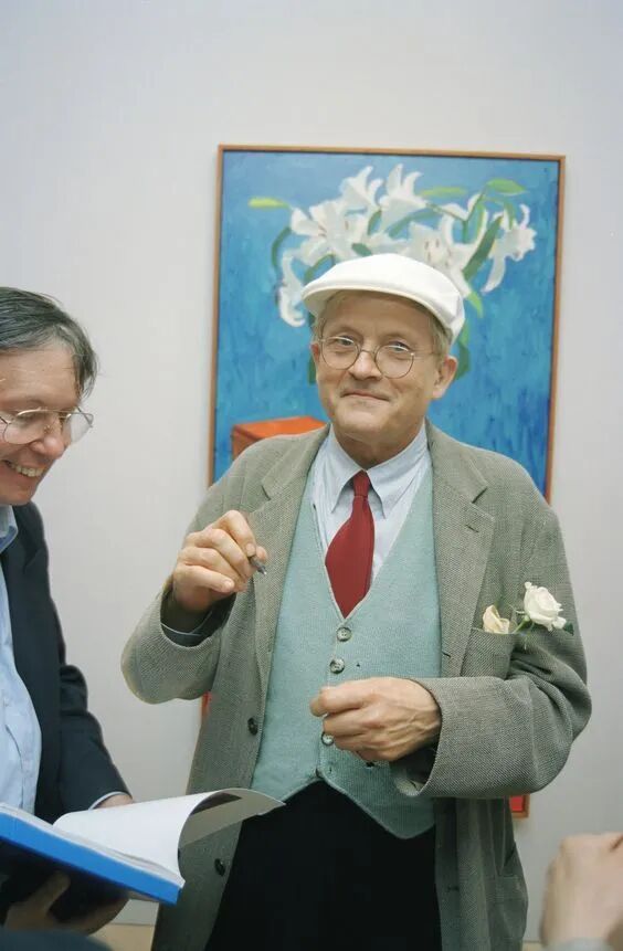 不同于普通的英伦艺术范,霍克尼经常喜欢穿着又破又旧的灰色西装,头戴鸭舌帽,与他作品里自带的稚拙风格自成一体。