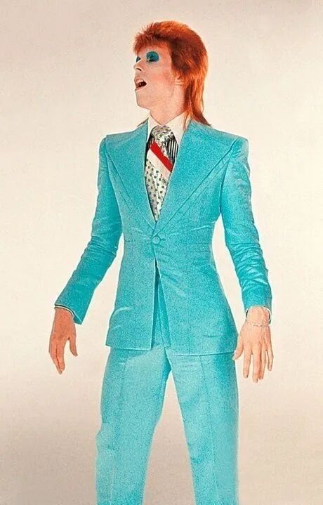留给世人印象最深的一个大卫·鲍伊,就是一头樱桃色的头发,闪电型妆容,以及亮片闪闪的男士迷你裙。