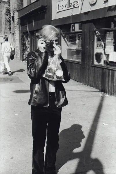 Andy Warhol photographs the photographer on the sidewalk outside the offices of the Village