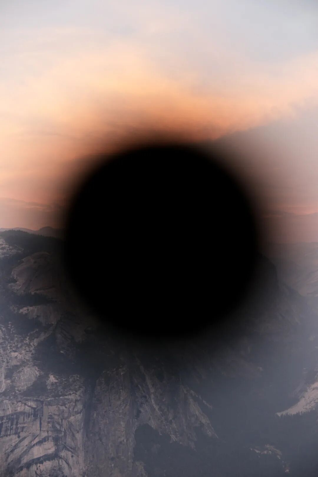 Vista Point 系列的风景都会被图像中心一团黑洞般的阴影掩盖。实际上,这是一块贴在相机镜头上的硬币。边缘的景观提供了足够的线索,让想象空间填补了黑暗色块的空虚。