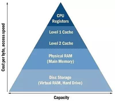 电脑的内存架构,实际上要细分为 Register (寄存器), Cache (高速缓存), Memory(内存), Disk (硬盘). 而缓存又可以细分为一级缓存 (Level 1 Cache), 二级缓存, 三级缓存, 甚至四级缓存.