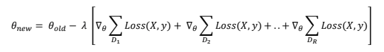 同步 SGD 所依赖的核心技巧是将更新规则中的求和在更小的 (mini)batch 子集上进行分割。D 被分割成 R 个子集 D₁, D₂, . .(推荐每个子集具有相同数量的样本),所以 将标准的 SGD 更新公式中的求和进行分割,得到: