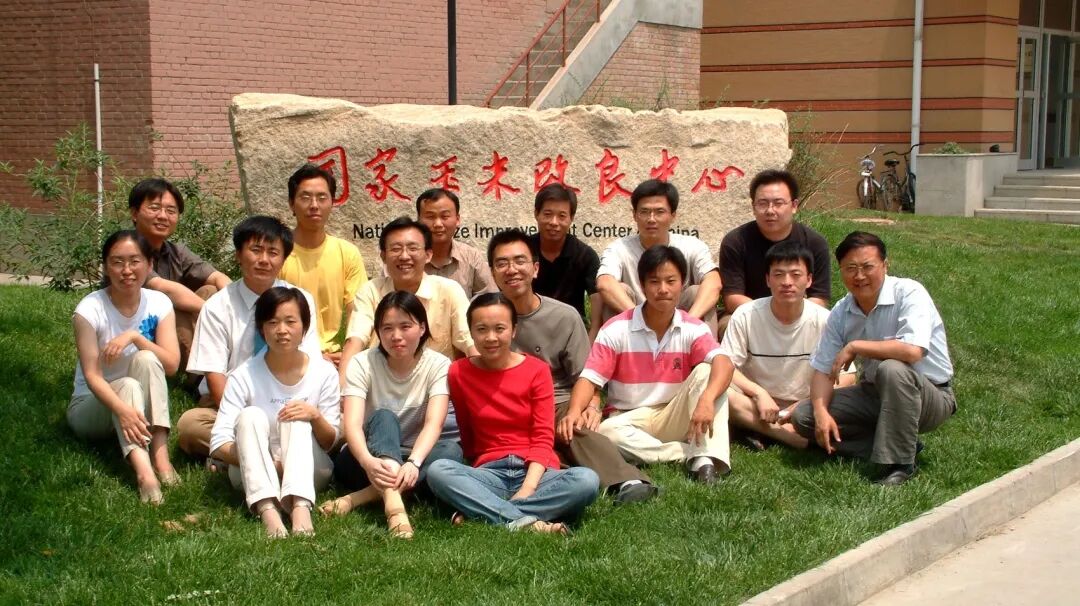 2004年团队在国家玉米改良中心前合影(第二排右一李建生,前排中杨小红,后排左一严建兵)