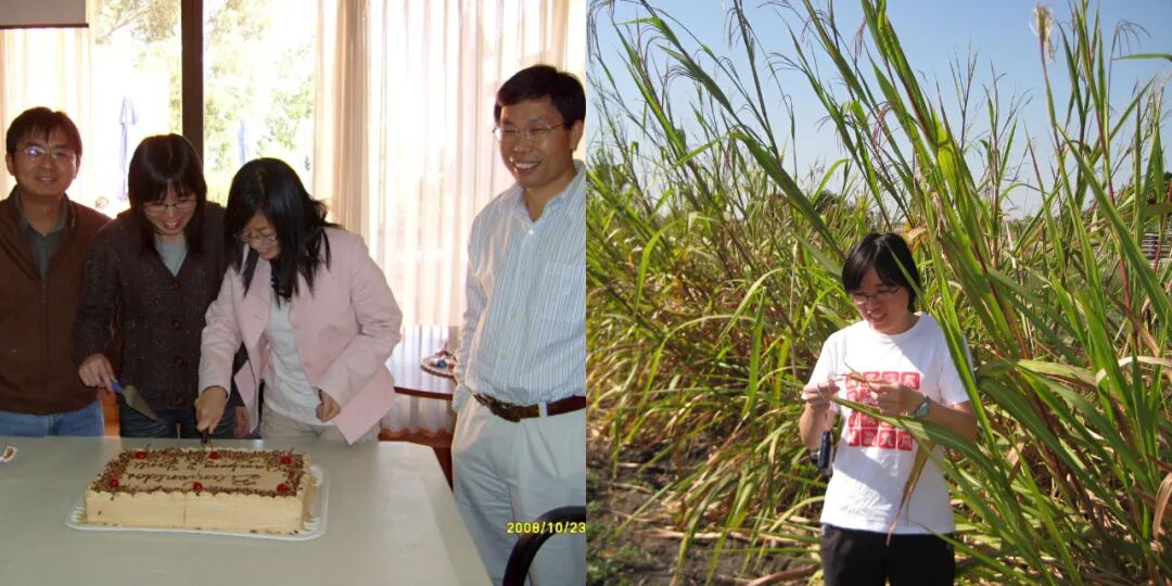 2008年杨小红与严建兵教授等在CIMMYT访学时的合影(左图)以及她在CIMMYT野生玉米基地观察野生玉米(右图)