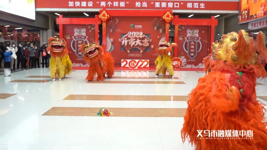 在义乌副食品市场,舞狮表演与经营户忙碌的场面构成了一幅热闹的开市画面。经营户黄荣永是娃哈哈品牌义乌总经销,主打各类饮品,客户主要为义乌城区的小卖部、批发部。今天市场开市,有客户8点不到就来候场。开业两小时,店中的各类商品均有百件的销量。