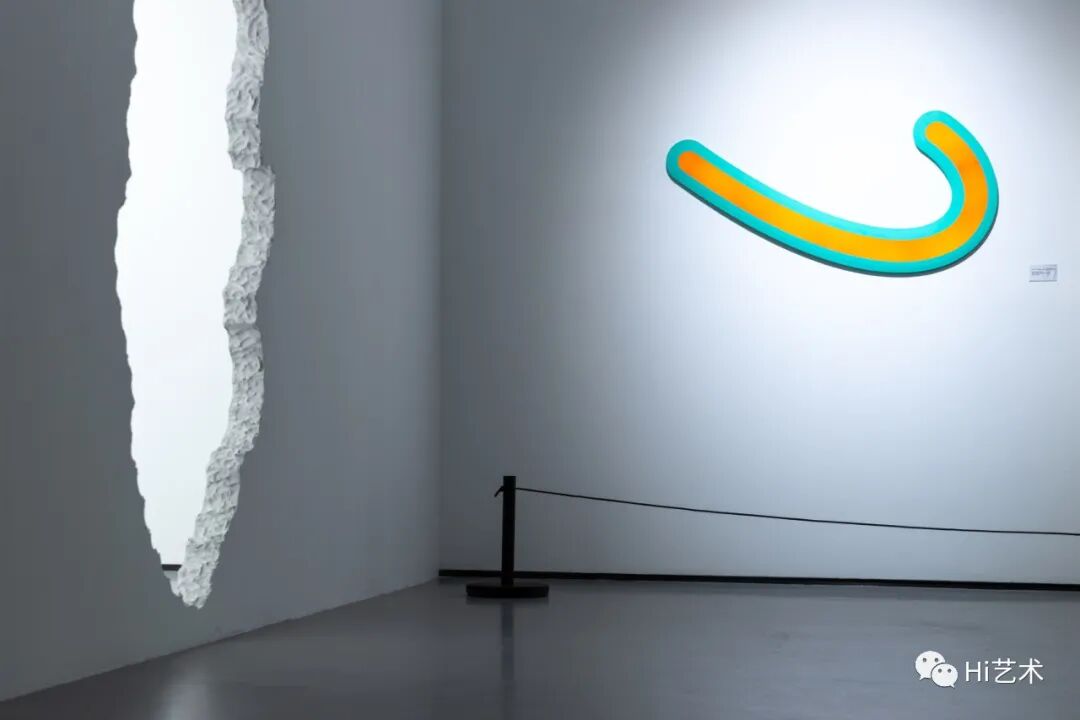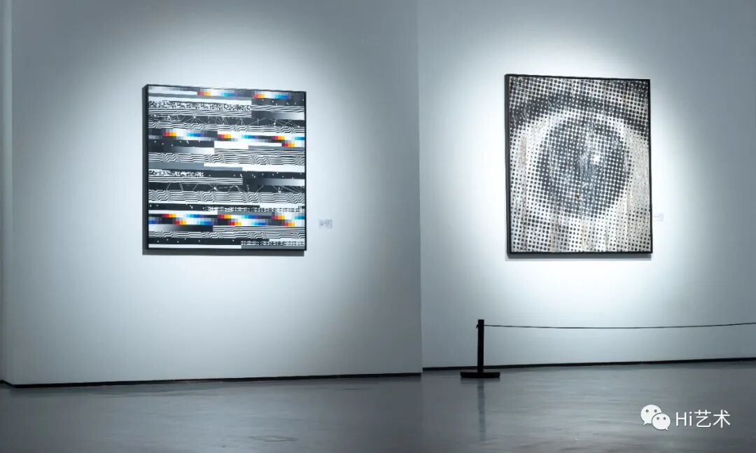 厦门宝龙艺术中心“有事发生”展览现场,曾在上海唐妮诗画廊和昊美术馆(温州馆)展出过的阿根廷裔西班牙街头艺术家费利佩 · 潘通(Felipe Pantone)的《Chromadynamica 112》(2019),法国街头艺术家JR的《Black and white photo on wood》