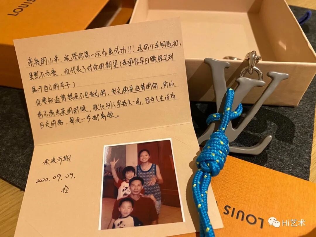 为了庆祝弟弟第一次做展览,姐姐送了何冠希一把钥匙扣。她在随礼物中附赠的贺卡中写道:“梦想是不会发光的,发光的是追梦的你。所以看不清未来的时候,就比别人坚持久一点,因为人生没有白走的路,每走一步都算数。”