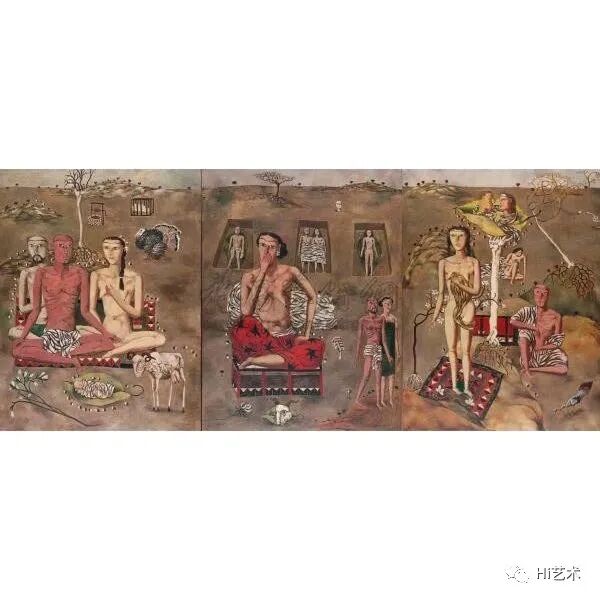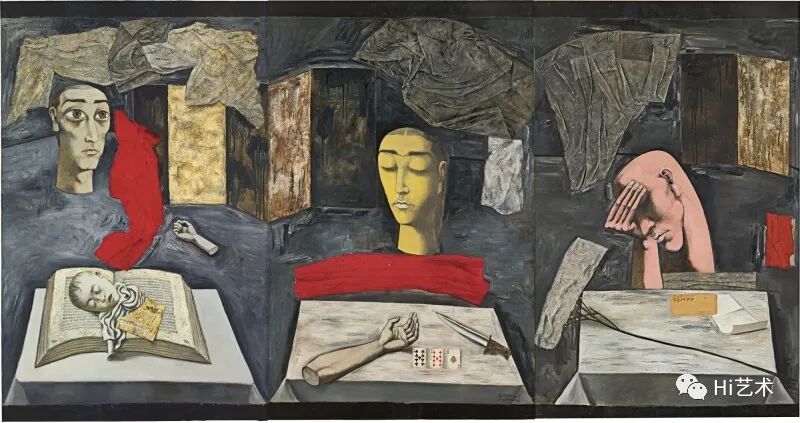 张晓刚 《黑色三部曲:驚恐、沈思、憂鬱》 179×342.3cm 油画混合媒材画布,共三部分 1989-1990