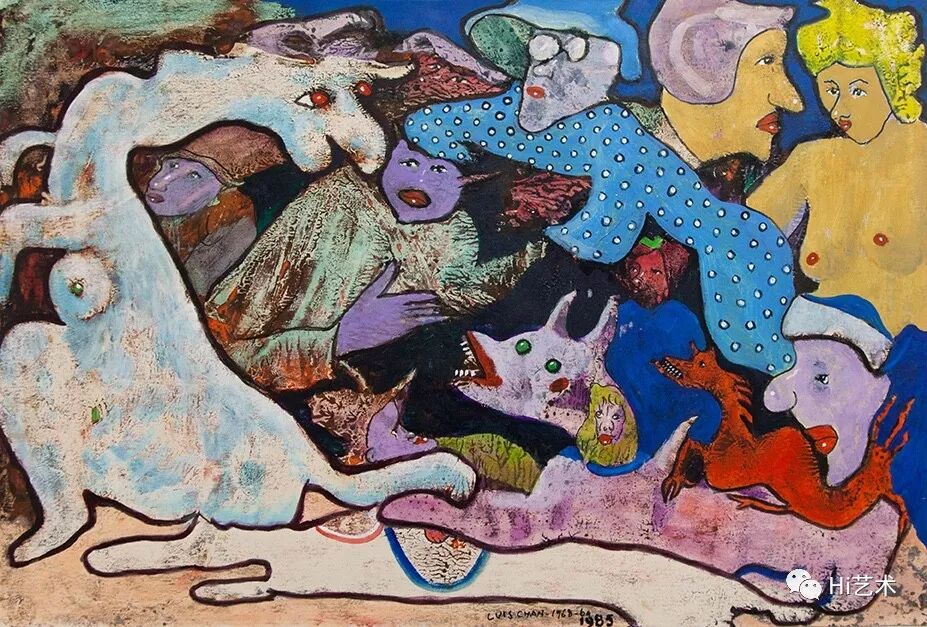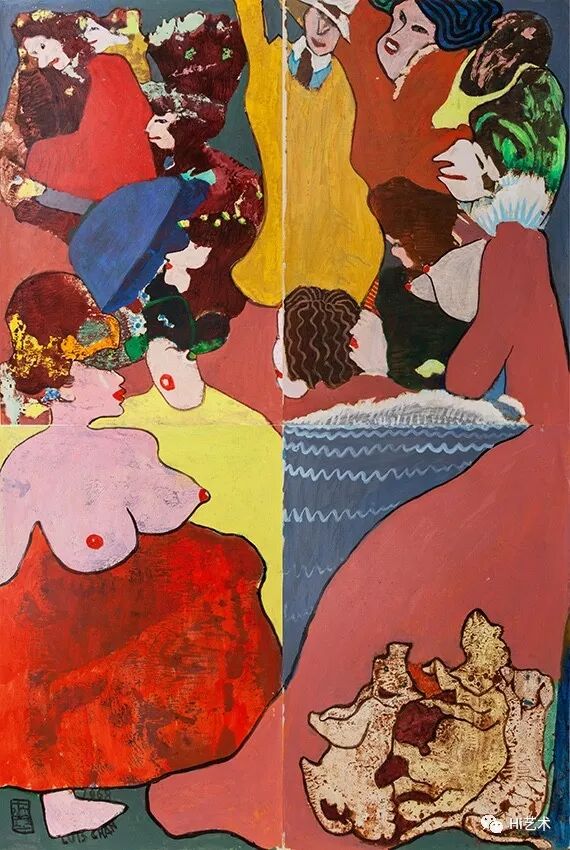 陈福善《争宠图》 152x102cm 塑胶彩纸本 1968
