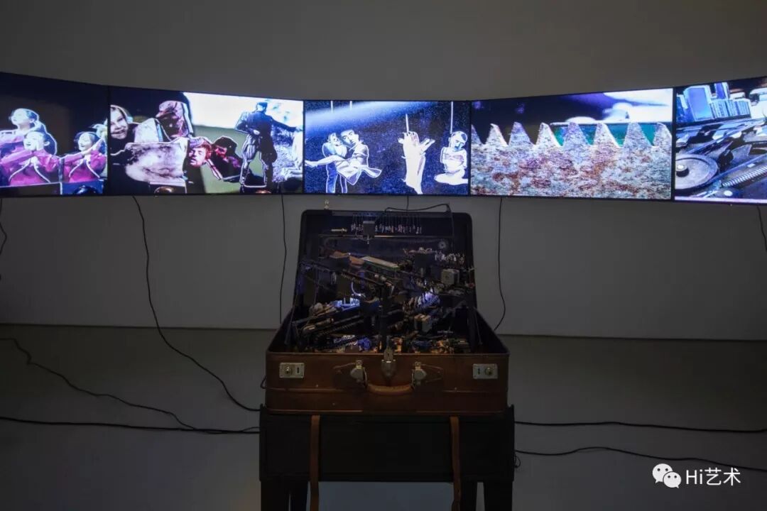 胡为一《低级景观1》 80×60×160cm 整体尺寸可变 摄像头、步进电视、轨道、皮质行李箱、亚克力、铜、铁、视频终端控制器 2013