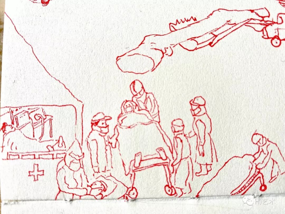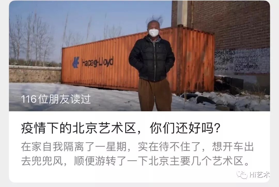 刘钢在接受物资现场身处武汉的李继开于元宵节发给朋友写照当下生活的绘画作为问候,让不少记挂他的人落下了心中的石头。回湖北洪湖老家过年的艺术家李燎因为疫情被困在洪湖,每天除了睡觉逛超市就是去江边打羽毛球。有时在江边不戴口罩会被街道巡查的人赶回家。洪湖的物价正常,偶尔买不到方便面。在江边散心的时候他拍了个小视频,算不上作品,就是玩玩。