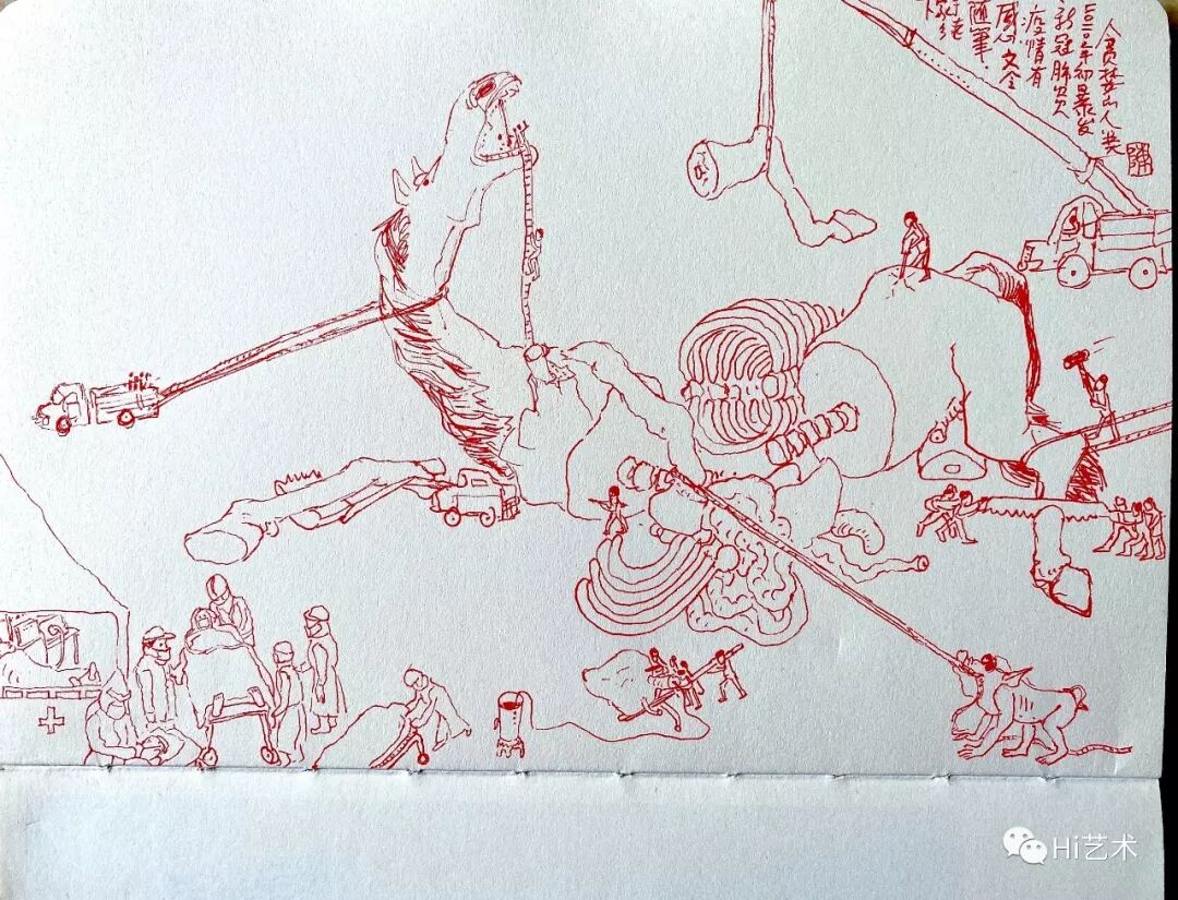 或许正是因为在这个特殊的时刻,谈论艺术变得不那么“政治正确”。事实上,我们不难看见那些正以艺术的名义消费疫情的艺术创作,而作为当代艺术媒体,此时的处境也稍显尴尬。在艺术家陈文令看来,最近中国有着成千上万的艺术家都在抄着疫情的照片画画,没有任何的艺术观念,无意中暴露了中国艺术界的另一种疫情。但我们似乎没有必要谈之色变,他说道,“中国人正在遭受一场由于过度贪婪所带来的自然界对我们的严重惩罚,今早沟勒一张小线描表达了我的一点震感。 ”在无法冲往第一线支援的时候,“宅”,成了大半个中国的常态。艺术家更是如此。杨欣嘉的日常创作并没有受到太大的影响,还在自己的公众号存档了一系列疫情相关的视频与图片。他这些年的工作,基本上人到哪里工作室就在哪里。这个工作室可能是大脑里的方案储存库、一台电脑、一个水彩本、快捷酒店客房、家里,当然也包含开展固定创作的实体工作室。杨欣嘉说:“比如‘独步者的黄昏’系列图像作品就是利用碎片时间在家里的电脑完成的。我需要做的就是在网络上搜寻海量的素材,选取可用的图像,再用PS去处理制作,然后就是心平气和地倾注进去大量的时间,随时随地见缝插针就可以开始。所以疫情来时,我还是保持之前的工作节奏,还依然继续着‘独步者的黄昏’的图像创作。除了尽量省去外出的时间,其他状态和往常无异。这两年投入比较多的时间就是做‘手机玩我’微信公众号,这个工作在目前也没有停止下来,除了编辑一些之前酝酿好的有计划的内容,还有常设线上项目的更新,除此以外就是会有一些贴紧外部语境的应景式内容,比如之前‘艺术家费用’的系列语音讨论,和最近与武汉相关的内容。”艺术家黄立言做了一系列小视频,初衷就是为了打发无聊的时光