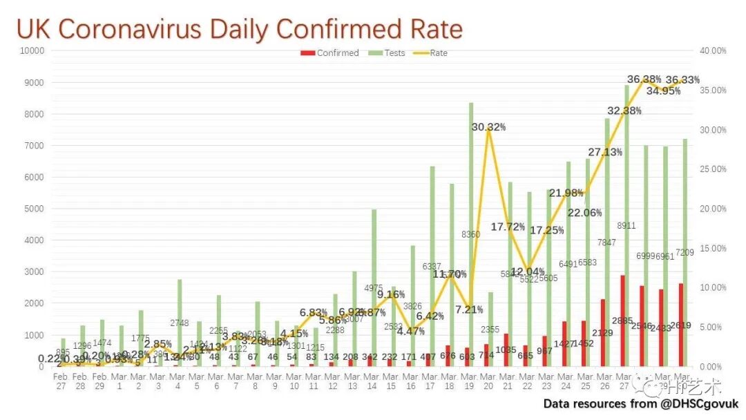 截至伦敦时间3月30日,英国关于新冠疫情检测数据“确诊数据:绿色为每天测试数量,红色为确诊数,黄色为确诊数据比例(图:DHSCgovuk)