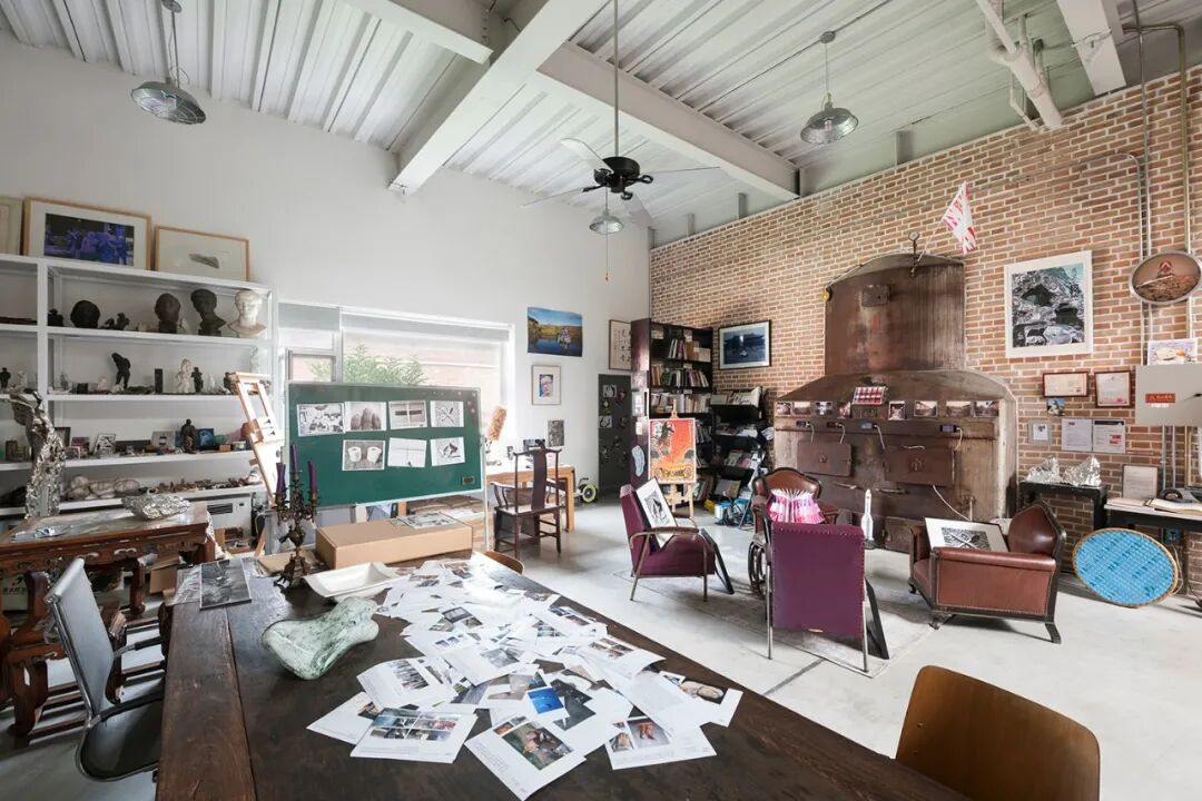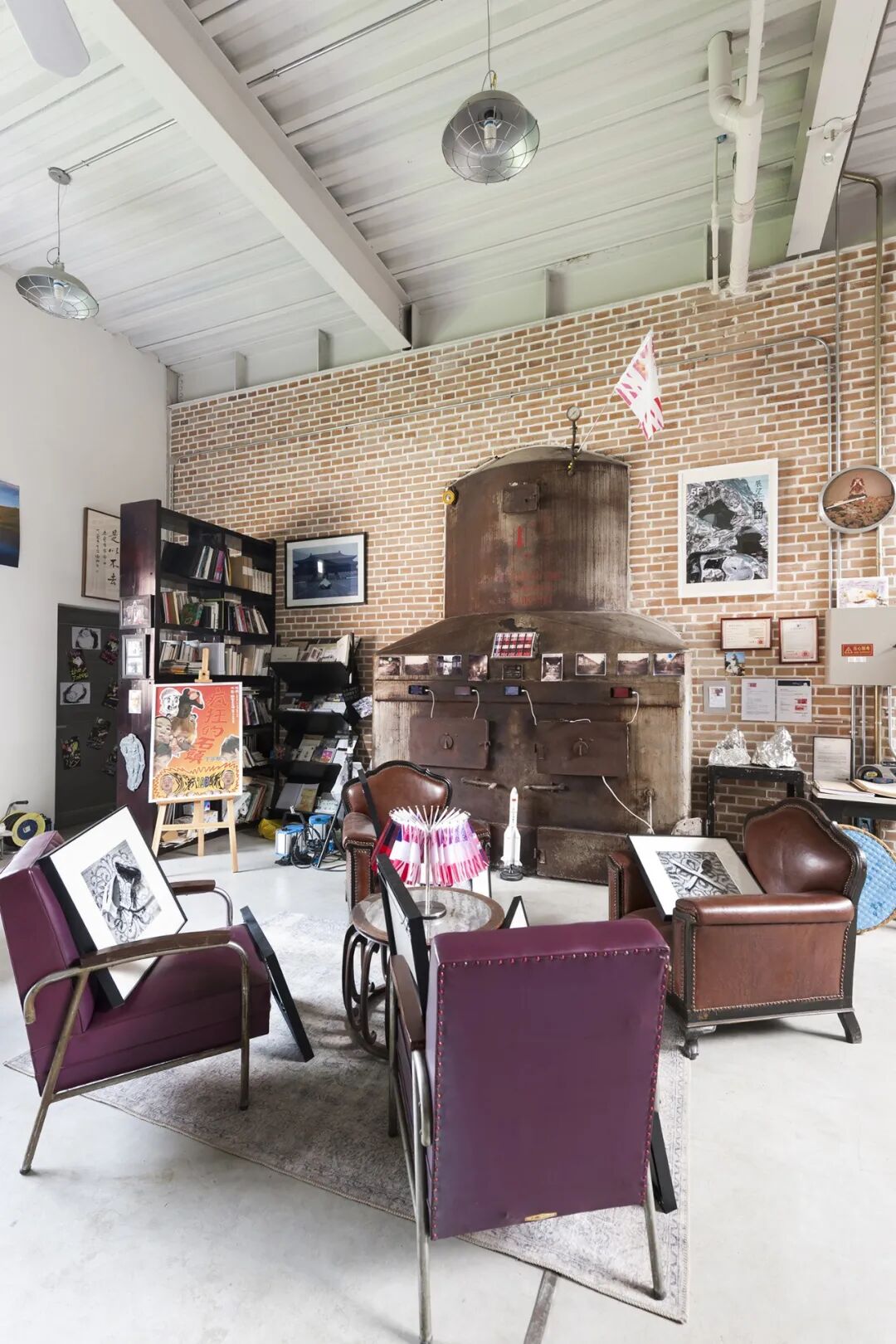 工作室的桌面上是展望回顾自1988年毕业至今艺术创作的“扑克牌”新书;旧厂房的锅炉被他移动过来,用作墙面的隔断。