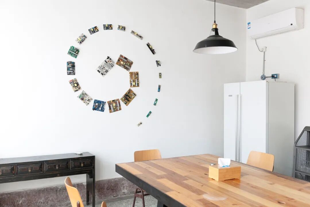 食堂内的墙上是展望做《觉着》(生活之内-JYA艺术项目)没用完的电路板;门口是石头切割而成的台阶。