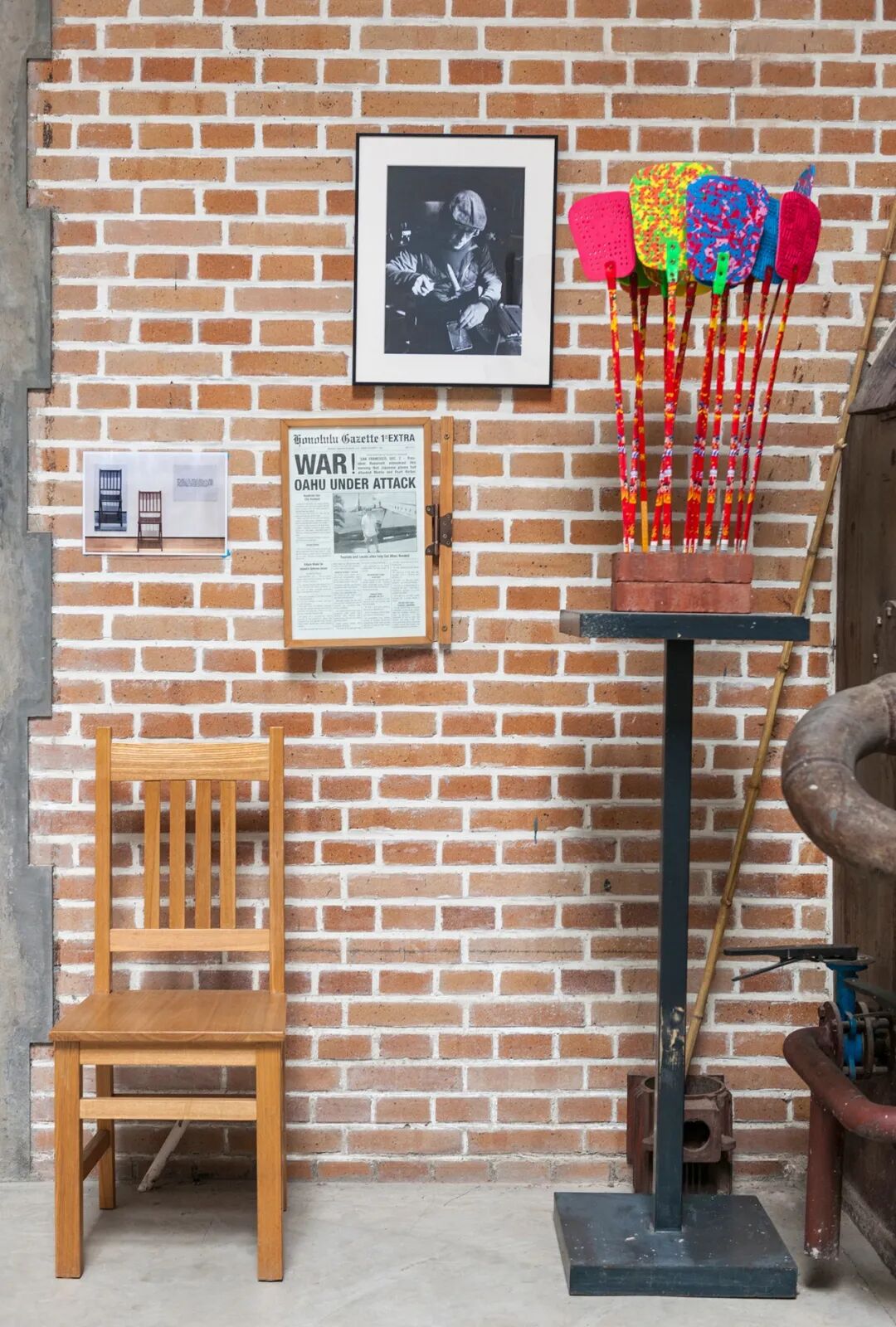 乡镇里常见的苍蝇拍被展望摆出了仪式感;墙上的椅子是一张来自网络的约瑟夫·克索斯1965年作品《一把椅子和三把椅子》图片,地上是展望的《第四把椅子——复制的椅子》。