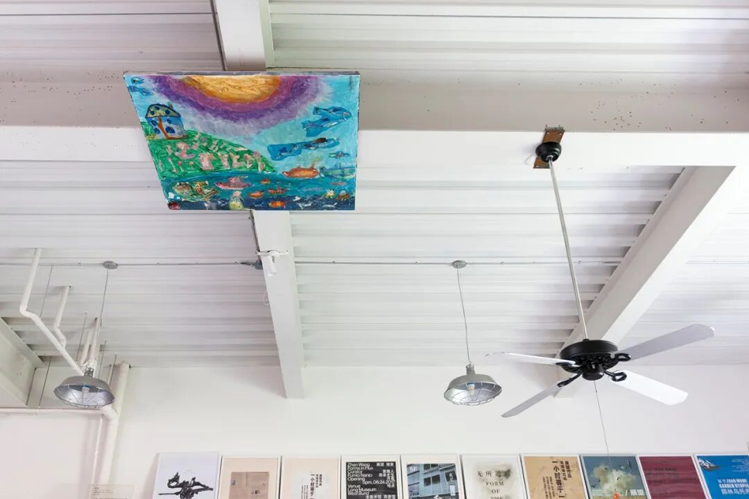 工作室的展架上是他为自己在长征空间的最新个展“埃迪亚物”选择的参展作品;屋顶上的画,是他从饭店垃圾站捡回来的。