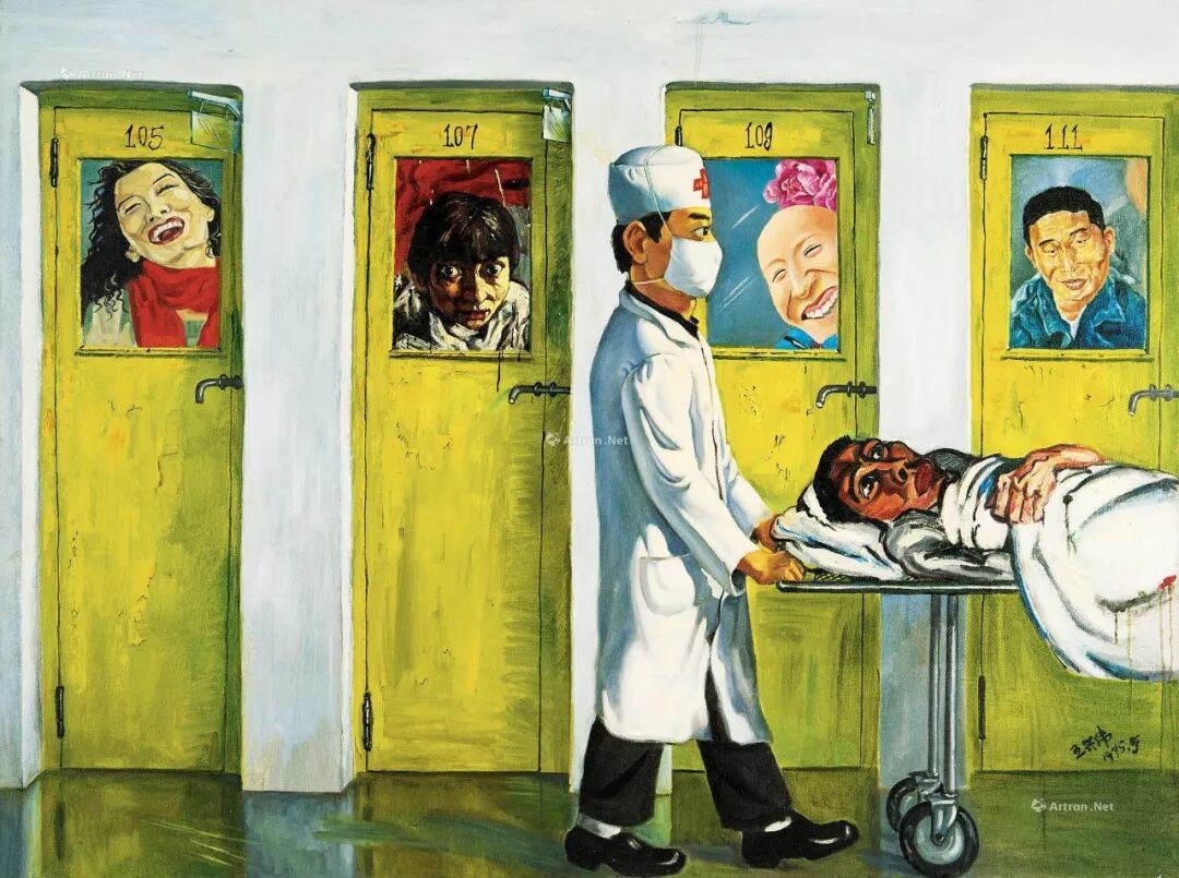 当王兴伟的老师宫立龙看到《八五后标准表情》之后,第一反应是:这是“油漫画”——即用油画的语言与绘画方式创作的漫画。而这种夸张诙谐的“漫画式”语言恰好生动地呈现出艺术家对于当时中国艺术界及社会状态的某种批判性思考。从画面细节看,在一种看似“非介入”的客观呈现背后,依然有着画家独到的对于画面结构的精心设计:“为了画面的紧凑和连贯,我把每一扇门都处理的很窄,因为如果按写实的方式,每扇门背后对应的空间实际上是无法放入一个完整的人的。”