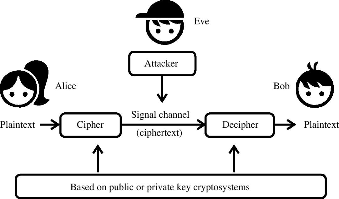 Alice将欲发送的明文(即数码信息)输进加密机, 经由某种密钥变换为密文, 密文在公开信道中传递给合法用户Bob, 后者使用特定密钥经由解密机变换为明文. 任何窃听者都可从公开信道上获取密文, 窃听者Eve如果拥有与Bob相同的密钥, 便可轻而易举地破译密文. 如果窃听者虽不拥有破译的密钥, 但他具有很强的破译能力, 也可能获得明文. 只有当窃听者肯定无法从密文中获取明文, 这种保密通信才是安全的.