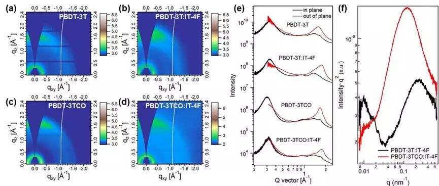 最后,为了研究Jsc和FF存在较大差异的原因,作者用空间限制电荷方法测量了两组活性层的电子与空穴迁移率,发现聚合物PBDT-3TCO:IT-4F的活性层电子与空穴迁移率(10-4 cm2 V-1s-1)比PBDT-3T:IT-4F(~10-6 cm2 V-1s-1)提高了近2个数量级。AFM结果显示,PBDT-3T:IT-4F混合膜具有差的相分离形貌,而PBDT-3TCO:IT-4F具有较好的双连续相分离。为了深入研究羰基的引入对活性层形貌的影响,他们与西安交通大学马伟团队合作,通过GIWAXS和R-SoXS对活性层进行详细研究。GIWAXS结果(图4)表明,引入羰基后,纯聚合物薄膜的p-p堆积距离从3.99 Å减少到3.77 Å。混合膜的p-p堆积距离从3.57 Å减少到3.53 Å,其相关长度从19 Å 增加到20 Å。这些都反映了引入羰基有利于改善分子间的电荷传输能力。R-SoXS结果(图4)显示,PBDT-3TCO:IT-4F混合膜的相区尺寸为25.8 nm,而PBDT-3T:IT-4F仅为13 nm。另外PBDT-3T:IT-4F混合膜相区纯度仅是PBDT-3TCO:IT-4F混合膜的一半。这些结果进一步说明了,器件性能的提高主要来源于引入羰基后,优化了其活性层形貌,提高了电池内部的激子解离与电荷传输。