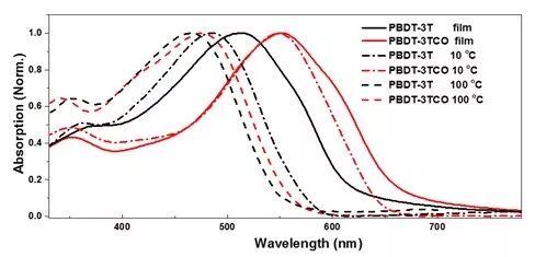 图2. PBDT-3T和PBDT-3TCO分别在100oC, 10 oC和薄膜中的吸收光谱。