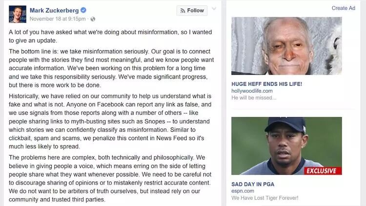 到 2016 年年底,扎克伯格在 Facebook 发文为虚假信息传播道歉。不只一个人在道歉信右侧看到假新闻。