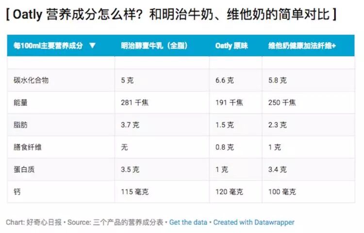 如果将 Oatly 原味燕麦奶跟明治醇壹全脂奶相比,前者每份(100ml)的蛋白质只有后者的三分之一,但脂肪也少了一半。钙质上,二者相差无几。