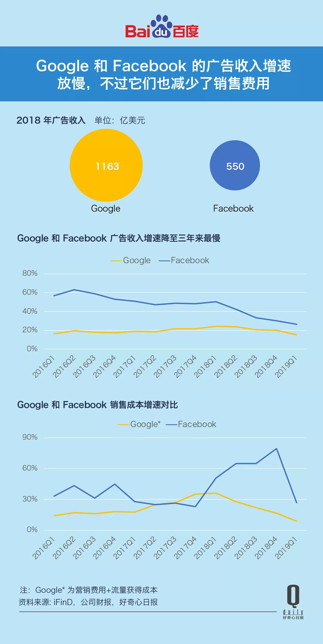 2019 年第一季度,放缓的广告业务营收增速拖累了 Google 整体营收增速,造成三年来最低的营收增幅。Google 广告收入增速变缓,意味着 Google 的流量增速不足以弥补广告价格的下滑。