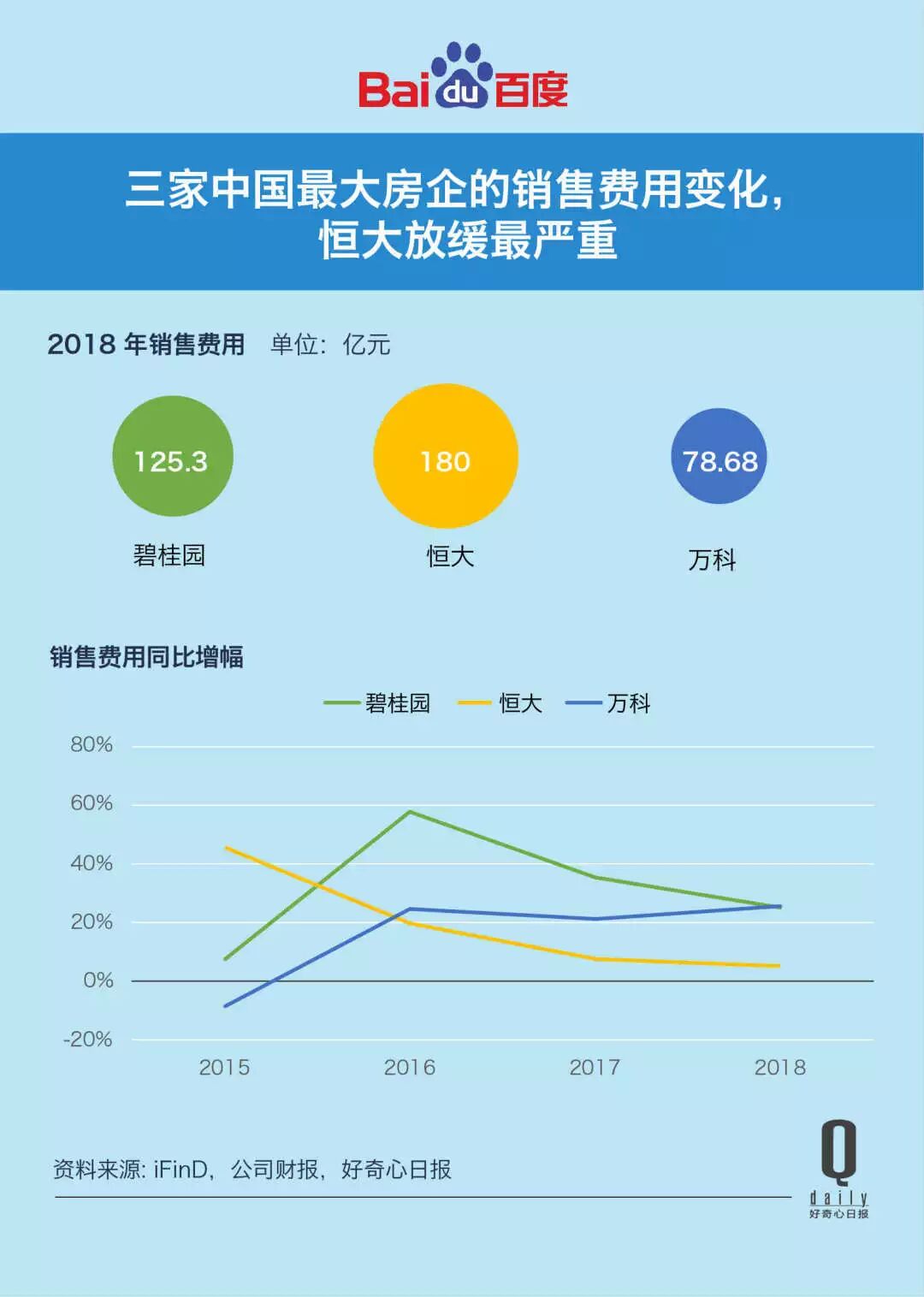 而地产公司在中国都是高负债经营,销售放缓就意味着现金流危机,各家也都在放慢销售开支以节省成本。2018 年,碧桂园和万科的销售费用增速都有所放缓。三家房企中增长最少的恒大,销售费用只增长了 7.68%。