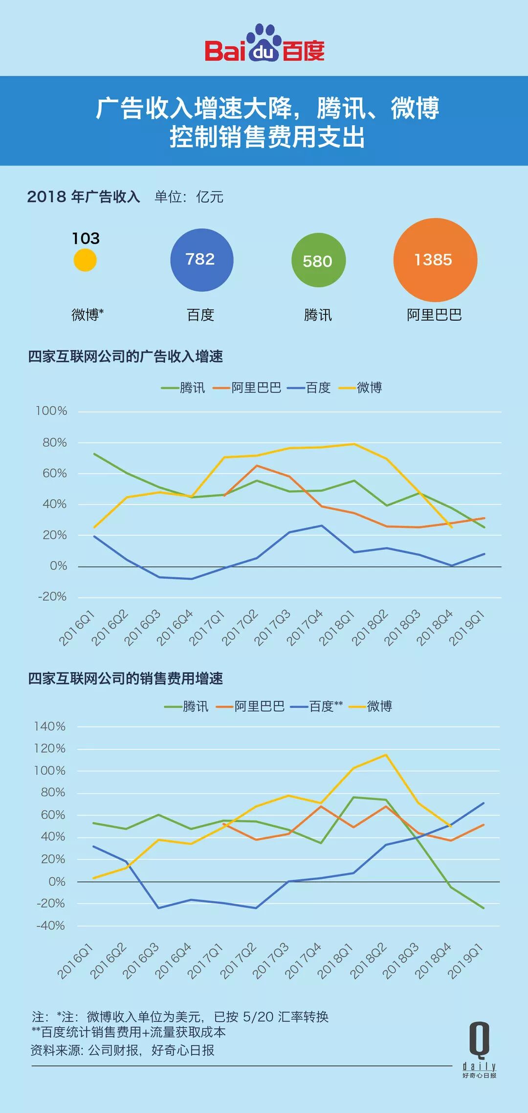 百度自 2017 年启动信息流项目,让人在里面看新闻。但作为广告载体,百度已经不太适合与头条相比。李彦宏称一季度每天有 1.78 亿人打开百度应用、2200 万人打开手机短视频。作为对比,头条 1.06 亿、抖音 2.5 亿。甚至,每天打开微博的人都有 2 亿人,高过百度。