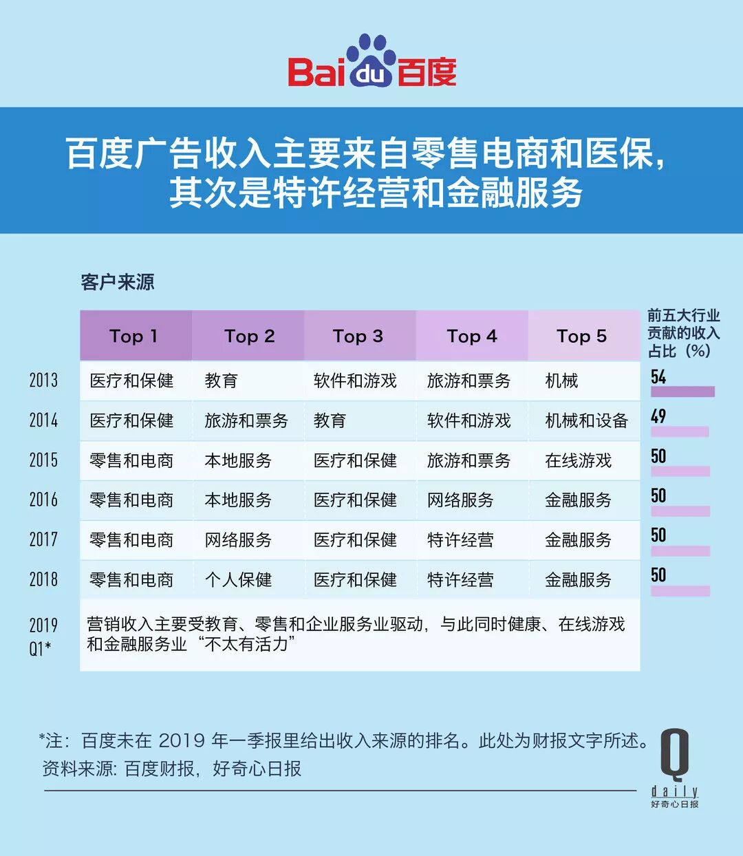 多年来,百度广告收入主要来自零售电商、医疗健康、特许经营服务、金融服务等行业。
