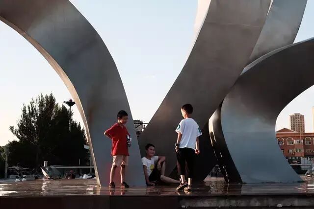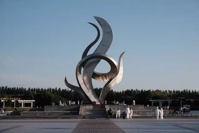 广场中央的雕塑,太极队正在周围聚集。摄影:朱凯麟/好奇心日报