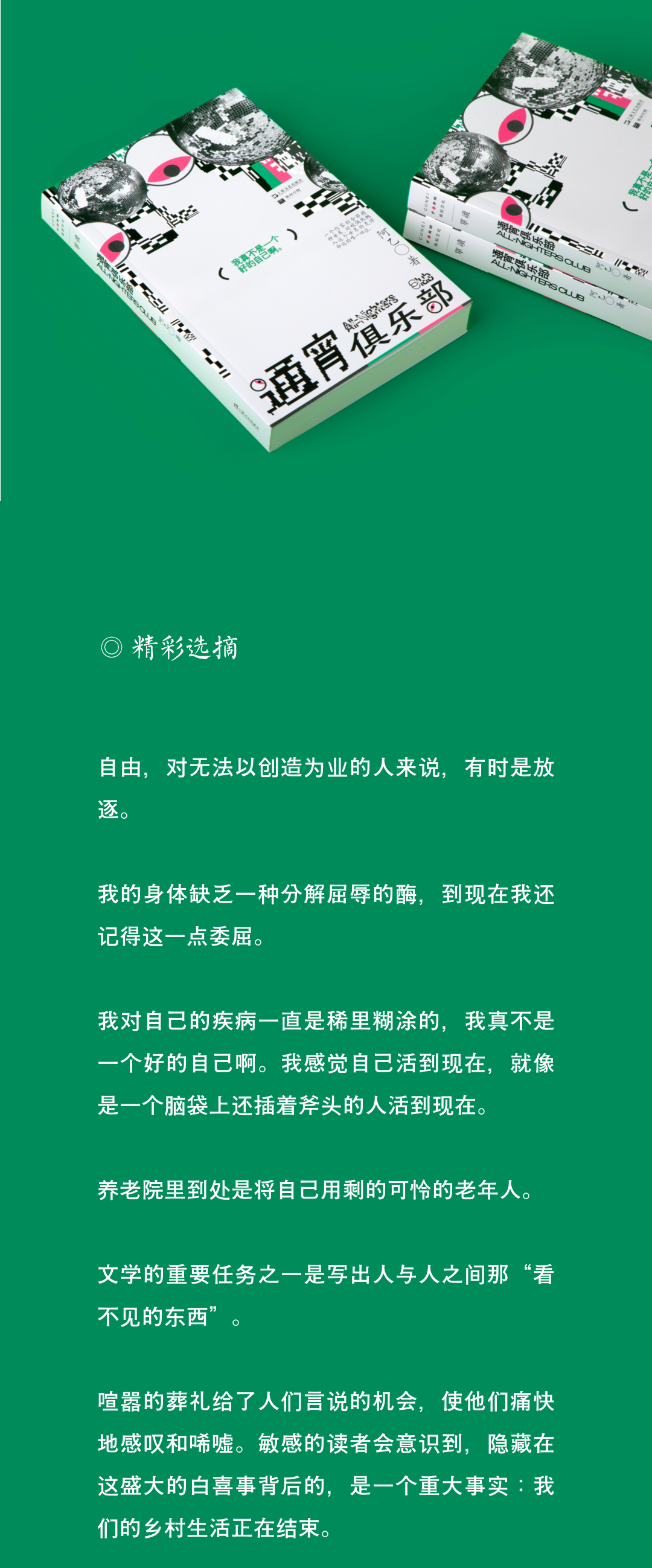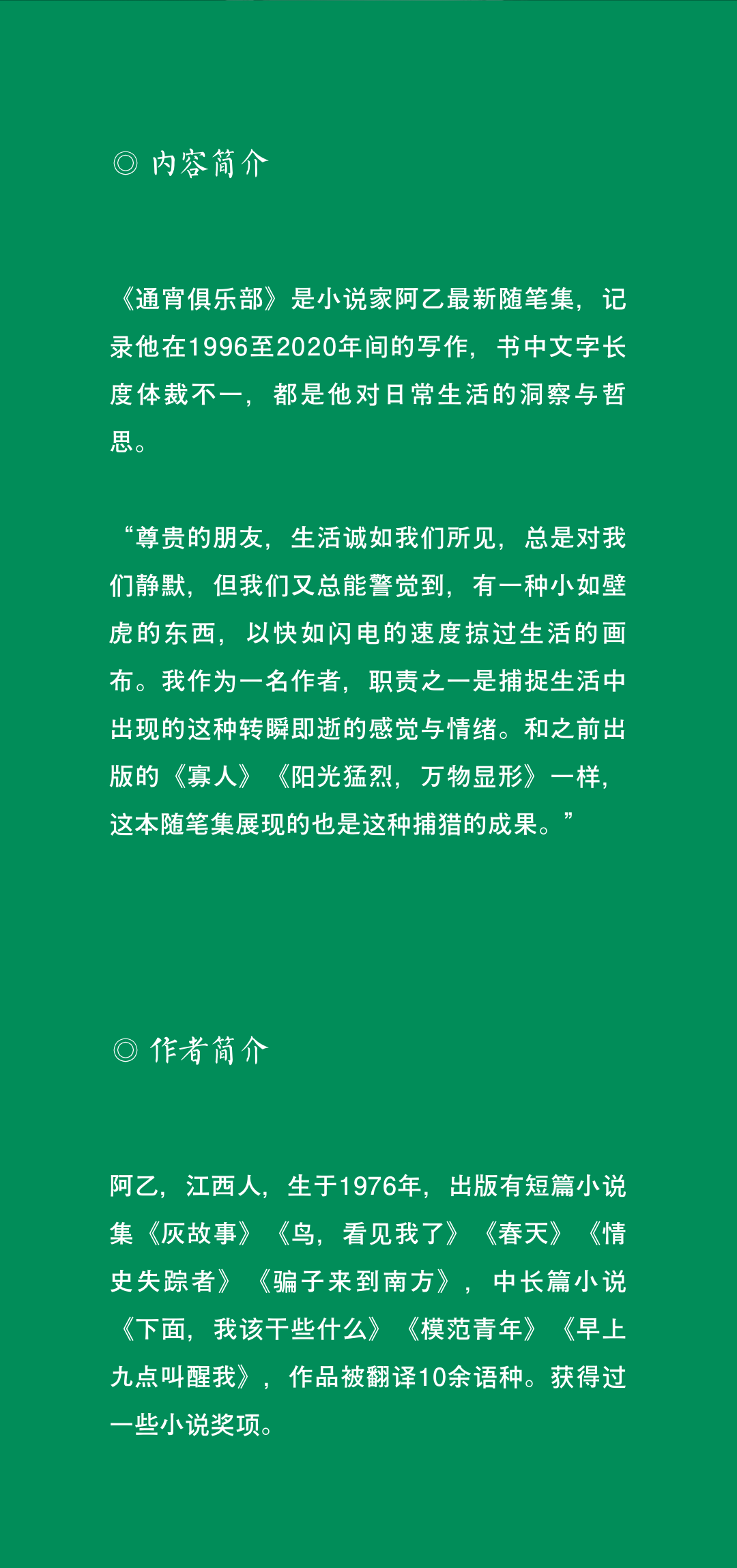对于以写作为志业的人来说,第一句话永远都是最难的。特别是当这个书写有非常明确的要求、体例之限,你非常明确地期待着,它应当要写成什么样子时,这个开始就变得异常艰难。写作,作为一种实践,好像反而成了束缚人“思想”的沉重枷锁。也正因此,当我们看到阿乙在单读新书 018《通宵俱乐部》中那些轻盈、灵动的段落,感受到一种久违的,唯独能从文字中获得的愉悦、兴奋。原本抽象、难以捉摸的,生活中支离破碎的东西浑然成为一个整体……原来还可以这样写!当我们不再以固定的文体、格式去限制,不再被一定要写成一个什么东西的功利想法桎梏住自己时,就像阿乙说的那样,“就可以一直写、自由地写,创造一种终生写作的方式”。前不久,在跟朋友的交谈中,阿乙回忆了创作初期的情形:很长一段时间里,写出来的东西发在网上,阅读量都只有“2”——自己和一位默默支持他的读者。早期写的那些东西,现在回看都比较幼稚,远不如现在,投稿也屡屡碰壁。支撑他继续写下去的,除了那一位读者的陪伴、那一个点击量,让他知道自己写的东西有人看之外,就是不断克服自己内心的那座山,一次次写下那生涩的第一句。《通宵俱乐部》不单是对生活中出现的转瞬即逝的感觉与情绪的捕捉,也是对一个作家如何读、如何写、如何在创作上成长起来的记录。阿乙“一直写”的创作实践持续了二十余载,或许能带给今天以写作为志业的年轻人鼓励:一个写作者,即便只写下那些或成熟或不成熟的句子、段落,哪怕它们就是注定会被废弃的开头、或是多余的素材,也一定可以给一个人的内心带来震荡,一定可以带着那自由的思想、真实的情感,抵达另外一个人的内心。