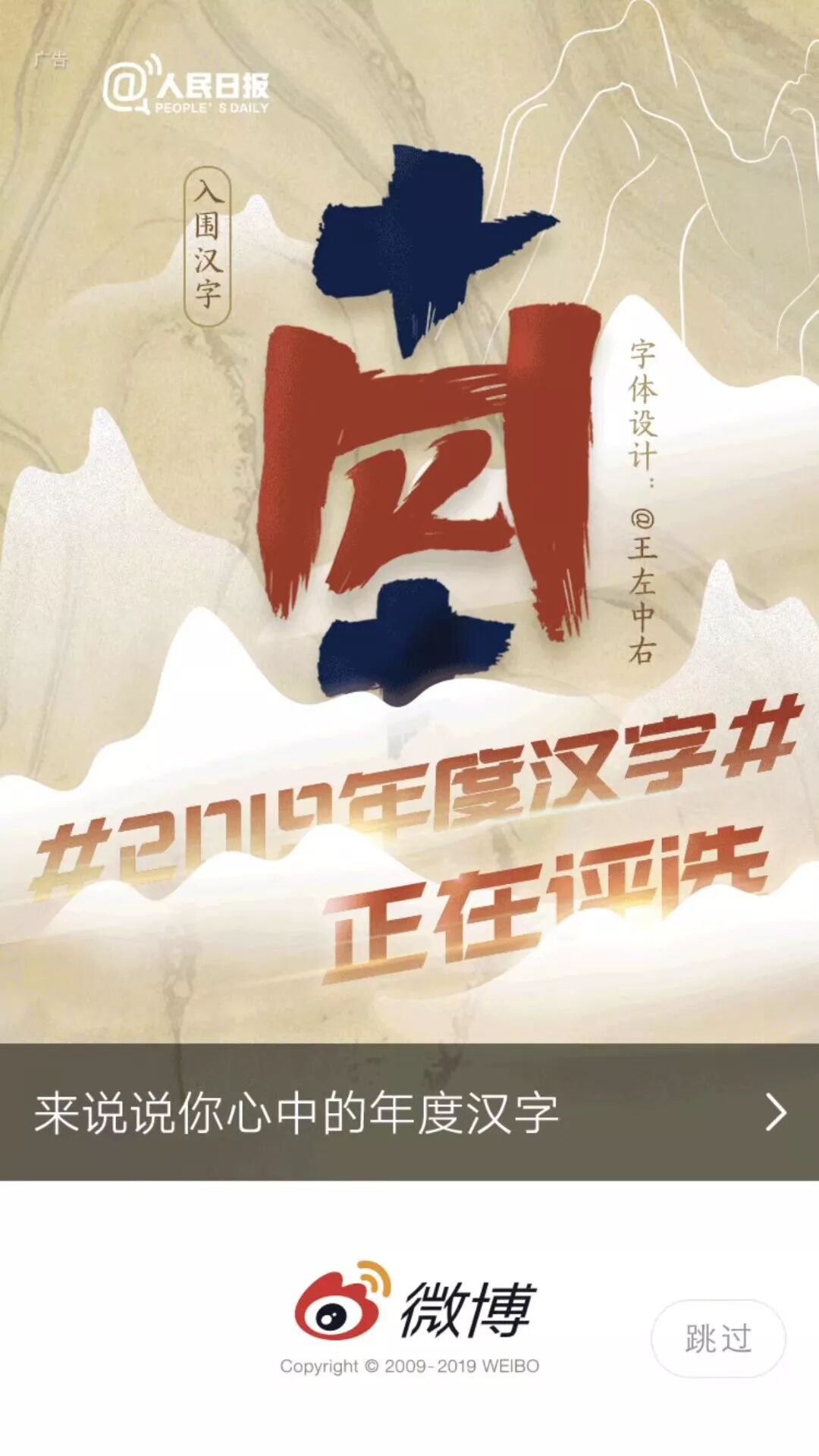 3、候选的年度汉字,届时将由本次活动的联合发起人,从所有应征汉字中共同选出,并进入最终的投票环节。最终的投票,将在微博话题#2019年度汉字##微盘点#下面进行,期待大家前去投票;