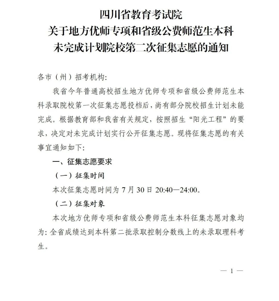 关于乡村振兴专项、地方优师专项和省级公费师范生本科未完成计划院校征集志愿的通知