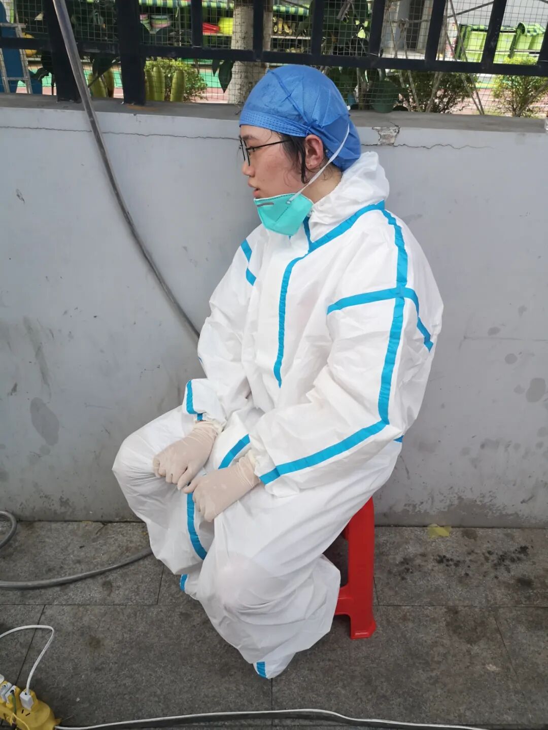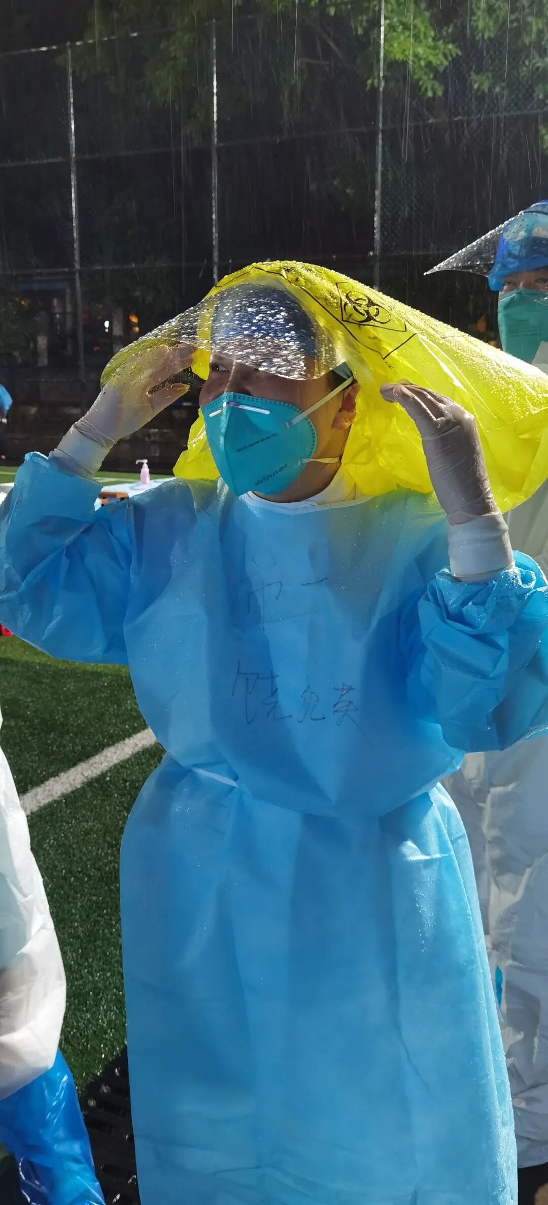 防护服里面是汗水,外面是雨水