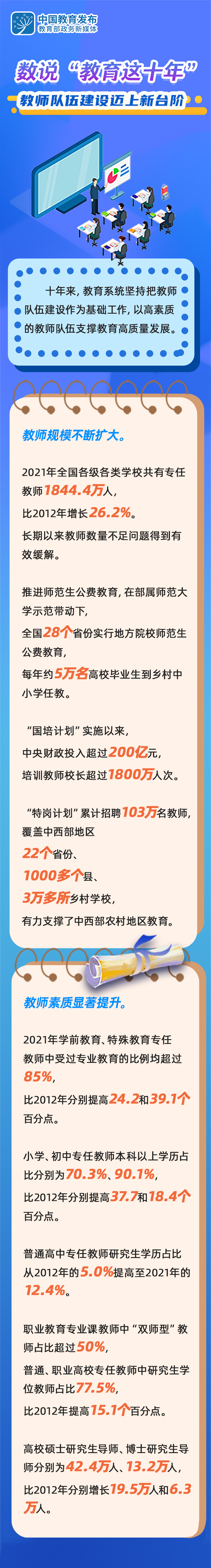 教育是国之大计、党之大计。党的十八大以来,我国教育面貌正在发生格局性变化。今天的“教育新征‘图’”专栏通过一组数据,“图”说十年来教师队伍建设迈上新台阶——