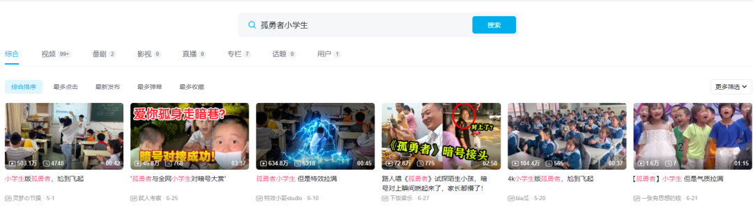 到目前,打开视频平台搜索“孤勇者小学生”关键词能得到海量视频,这是《孤勇者》在小学生群体中流行的最直观体现,且更新频率依然很高。