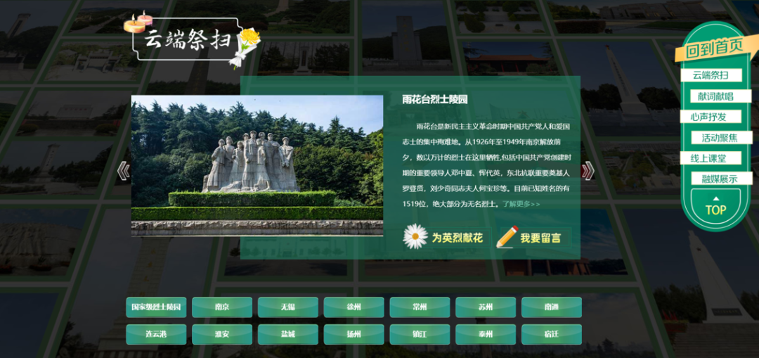 每一位革命先烈、每一种革命精神,都是一本鲜活的教科书。雨花台烈士陵园、抗日山烈士陵园、王杰烈士陵园、刘老庄八十二烈士陵园、杨根思烈士陵园……江苏各地的青少年云端打卡全省86家烈士陵园和纪念馆,一次次瞻仰墓碑,一次次敬献鲜花,一条条留言寄语,青少年们在庄严肃穆的仪式中接受“沉浸式”的精神洗礼,在缅怀中凝固永不忘却的家国记忆。