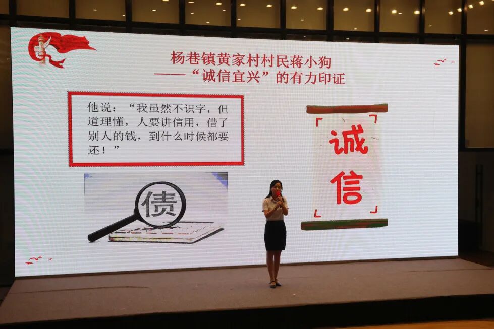 本次道德讲堂由宜兴市委宣传部、宜兴市文明办、中国人民银行宜兴市支行联合主办,江南农村商业银行宜兴支行承办,讲堂以共听诚信歌谣、共品诚信故事、共悟诚信文化等方式进行。