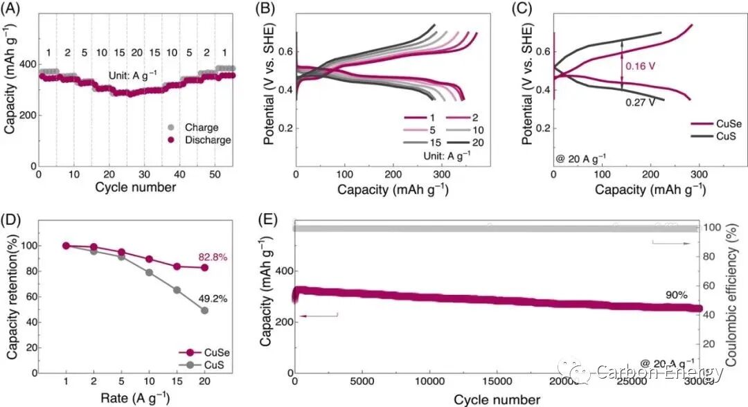 在碳中和的背景下,开发高安全性和低成本的水系电池具有重要意义。然而,由于水系电池容量相对较低且循环稳定性较差,其实际应用的进程一直受到困扰。近日,苏州大学 李亮&倪江锋/复旦大学 晁栋梁 团队提出了独特的硒化铜转换电化学,用于稳定和高能的水系电荷存储。原位 X 射线衍射和操作拉曼技术揭示了通过 Cu3Se2 和 Cu1.8Se 的中间体从 CuSe 到 Cu2Se 的可逆转变。这种转化过程激活了 Cu2+ 离子的氧化还原载体,并在 20 A g−1 时提供了 285 mAh g−1 的出色倍率能力和高达 30,000 次循环的电化学耐久性。此外,提出了 Cu2+ 和 H+ 共插入化学以促进转化过程。作为概念验证,耦合 CuSe//Zn 的混合水系软包电池能够分别提供 190 Wh kg−1 和 1366 W kg−1 的最大能量和功率密度。其成果以题为 "Conversion electrochemistry of copper selenides for robust and energetic aqueous batteries" 在国际知名期刊 Carbon Energy 上发表。